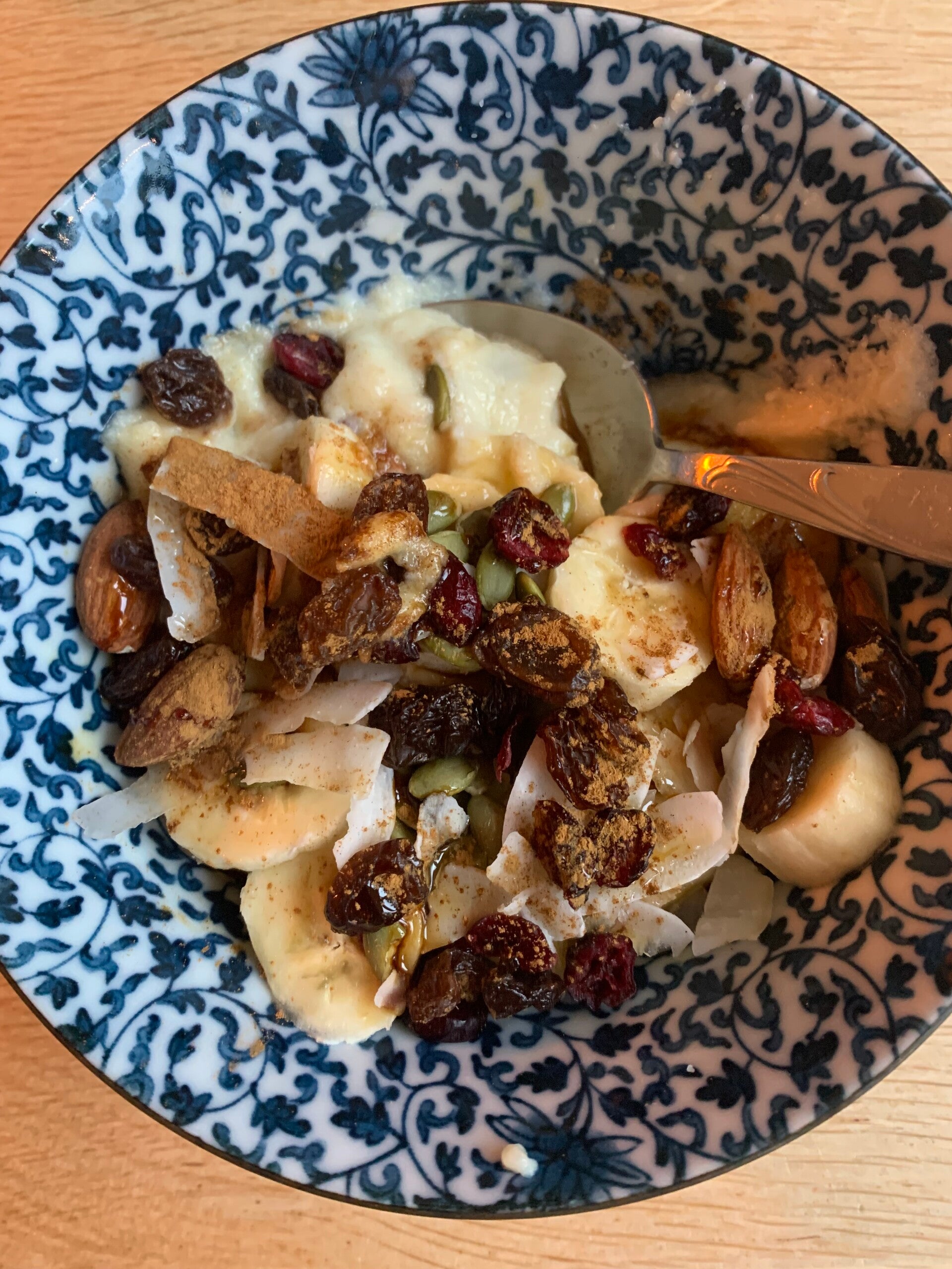 7. Creëer je ultieme topping: kokos, zaden (pompoen-, sesam-, zonnebloempitten), noten, kaneel, honing, rozijnen en meer!